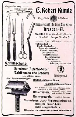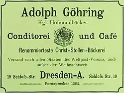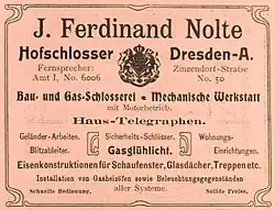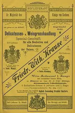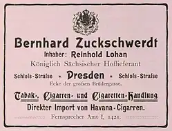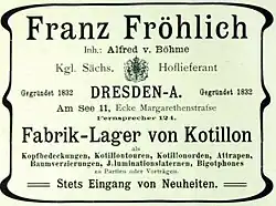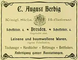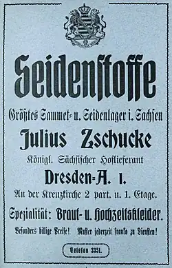- ↑ a b c d e f g h i j k l m n o p q r s t u v w x y z aa ab ac ad ae af ag ah ai aj ak al am an ao ap aq ar as at au av aw ax ay az ba bb bc bd be bf bg bh bi bj bk bl bm bn bo bp bq br bs bt bu bv bw bx by bz ca cb cc cd ce cf cg ch ci cj ck cl cm cn co cp cq cr cs ct cu cv cw cx cy cz da db dc dd de df dg dh di dj dk dl dm dn do dp dq dr ds dt du dv dw dx dy dz ea eb ec ed ee ef eg eh ei ej ek el em en eo ep eq er es et eu ev ew ex ey ez fa fb fc fd fe ff fg fh fi fj fk fl fm fn fo fp fq fr fs ft fu fv fw fx fy fz ga gb gc gd ge gf gg gh gi gj gk gl gm gn go gp gq gr gs gt gu gv gw gx gy gz ha hb hc hd he hf hg hh hi hj hk hl hm hn ho hp hq hr hs ht hu hv hw hx hy hz ia ib ic id ie if ig ih ii ij ik il im in io ip iq ir is it iu iv iw ix iy iz ja jb jc jd je jf jg jh ji jj jk jl jm jn jo jp jq jr js jt ju jv jw jx jy jz ka kb kc kd ke kf kg kh ki kj kk kl km kn ko kp kq kr ks kt ku kv kw kx ky kz la lb lc ld le lf lg lh li lj lk ll lm ln lo lp lq lr ls lt lu lv lw lx ly lz ma mb mc md me mf mg mh mi mj mk ml mm mn mo mp mq mr ms mt mu mv mw mx my mz na nb nc nd ne nf ng nh ni nj nk nl nm nn no np nq nr ns nt nu nv nw nx ny nz oa ob oc od oe of og oh oi oj ok ol om on oo op oq or os ot ou ov ow ox oy oz pa pb pc pd pe pf pg ph pi pj pk pl pm pn po pp pq pr ps pt pu pv pw px py pz qa qb qc qd qe qf qg qh qi qj qk ql qm qn qo qp qq qr qs qt qu qv qw qx qy qz ra rb rc rd re rf rg rh ri rj rk rl rm rn ro rp rq rr rs rt ru rv rw rx ry rz sa sb sc sd se sf sg sh si sj sk sl sm sn so sp sq sr ss st su sv sw sx sy sz ta tb tc td Inserat im Adressbuch der Hoflieferanten im Königreiche Sachsen, Dresden von 1905.