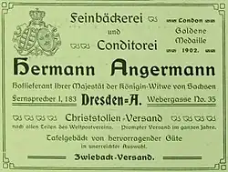 - Hermann Angermann, Bäcker und Conditor (siehe Anzeige), Dresden, Webergasse 35[3]
