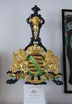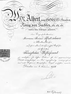 Im Königreich Sachsen konnte ein Unternehmen, deren Inhaber oder ein bestimmtes Produkt, vom Monarchen des Landes sowie Mitgliedern der königlichen Familie auf Grund der hohen Qualität der Produkte mit dem Titel Königlicher Hoflieferant geehrt werden. Solche Hofprädikate durften nur dann auf Geschäftsschildern, Etiketten, Anzeigen, Rechnungen, Briefbogen und dergleichen beworben werden. Eine Werbung auf Siegeln, Verschlussmarken und Stempeln war dagegen untersagt. Abgebildet werden durfte nur das Königlich Sächsische Wappen in der kleineren Form, als Herzschild in Schwarz und Gold neunmal geteilt und mit einem schräg linken grünen Rautenkranze belegt, woran am grünen, den Wahlspruch „Providentiae Memor“ („Erinnerung an die Vorsehung“) tragenden Bande der Hausorden der Rautenkrone hängt, mit zwei nach rückwärts schauenden goldenen Löwen als Schildhalter, das Ganze von einem Hermelin gefütterten und mit der Königlichen Krone bedeckten Purpurmantel umgeben[1]. Das Prädikat „Hoflieferant“ diente dabei in Sachsen als dauerhaftes Werbezeichen und bürgte zusätzlich für qualitativ hochwertige Waren. Der sächsische König sprach damit seinen Hoflieferanten das Vertrauen aus, ihn selbst oder die Mitglieder der königlichen Familie innerhalb des sächsischen Hofstaats mit Waren zu beliefern und zu versorgen. Zu beliefern war demnach je nach Bedarf die königliche Hofwirtschaft im Dresdner Residenzschloss, die Hofwirtschaft Schloss Pillnitz, das königliche Jagdschloss in Moritzburg sowie andere Hofhaltungen der Wettiner.