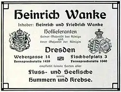 - Friedrich Heinrich Wanke, Mitinh. d. Fa. Heinrich Wanke, Fluss- und Seefische (siehe Anzeige), Dresden, Webergasse 14 und Fischhofplatz 3[3]
