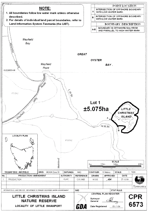 - ↑ CPR 6573. Litte Christmas Island Nature Reserve. Proclamation under the Nature Conservation Act 2002, Tasmania’s consolidated legislation online, 9. November 2005
