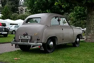 | Lloyd LP 400 | Limousine | 1953–1957 | 2 Zylinder; Zweitakt | 386 | 9,6 (13) | 3 | 75 |
