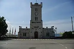 Der Haupteingang ist als viergeschossiger Turm mit zwei seitlichen Anbauten ausgeführt. Auf den Anbauten thronen 4 Löwenplastiken, die von dem Triester Bildhauer Giuseppe Capolino geschaffen wurden.