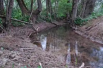 - (Zufluss), von rechts und Norden auf etwa 208 m ü. NN in Waldwimmersbach, ca. 2,2 km[LUBW 7] und ca. 1,7 km². Entsteht auf etwa 306 m ü. NN im Administrationswald. Im Dorf verdolt.