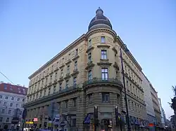 Von 1884 bis 1885 entstand auf dem Grundstück ein monumentales strenghistoristisches Miethaus, ein Frühwerk des Architekten Otto Wagner. Es steht an drei Seiten frei (Identanschriften: Gluckgasse 5, Führichgasse 12). Die südwestliche Ecke (Lobkowitzplatz und Führichgasse) ist durch einen Eckrundturm mit Kuppelbekrönung betont. Die Fassade zum Lobkowitzplatz ist als hoher Sockel mit kolonnadenartigen vorgeblendeten gebänderten toskanischen Riesenhalbsäulen mit dorischem Fries gestaltet und durch einen durchlaufenden Balkon mit Schmiedeeisengitter abgeschlossen. In den Obergeschoßen sitzen additiv gereihte gerade verdachte Fenster; zwischen den Fenstern des dritten Obergeschoßes verläuft ein Puttenfries. Den Abschluss bildet ein Konsolgesims.[1]