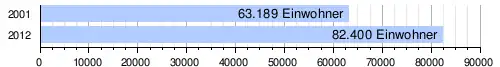 Das urbane Gemeindegebiet hatte bei der Volkszählung 2012 6771 Einwohner in 981 Haushalten,[1] bei der Volkszählung 2001 5906 in 805 Haushalten[7] und bei der Volkszählung 1988 3876 in 453 Haushalten.[8] Bei der Volkszählung 1977 waren es 2989 Einwohner.[9]