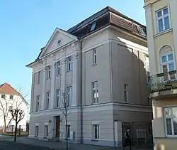 Das dreigeschossige historisierende verputzte Eckgebäude mit dem prägenden Giebelrisalit mit Pilastern mit ionischen Kapitellen, dem Logenwappen im Giebel, dem Erdgeschoss mit einer Bossenstruktur und einem Mansarddach wurde 1910 gebaut. Nach dem Verbot der Loge 1933, wurde es zu einem Wohnhaus umgebaut. Nach 1945 nutzte die Deutsche Handelszentrale Textil das Haus.