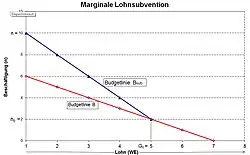 Es ergibt sich eine Verschiebung der Budgetgeraden von B nach Bsub. Die marginale Lohnsubvention setzt am Punkt G0 an und schafft im Modell vier neue Beschäftigte (n0 < n). Die fiskalischen Wohlfahrtseffekte ergeben sich wegen der nachfragewirksamen Outputeffekte für Nicholas Kaldor insbesondere bei allgemeinen (nicht selektiven) Lohnsubventionen. Allerdings ist bei einer selektiven Lohnsubvention die Transfersumme geringer. Einkommenseffekte werden als makroökonomisches Steuerungsinstrument betrachtet, denn zusätzliches Einkommen der Haushalte fließt aufgrund der geringen Sparquote direkt in die Konsumnachfrage. Aufgrund der Konsumfunktion wirken Lohnsubventionen somit als automatischer Stabilisator, denn sie glätten die Konjunkturschwankungen. Zwischen Nachfrage und Beschäftigung ergibt sich eine positive Rückkopplungsschleife, die sich nach jedem Durchlauf abgeschwächt fortsetzt. Lohnsenkungen dagegen drücken auf die Nachfrage und die Preise, schmälern damit die Gewinnaussichten. Die Idee der Lohnsubventionen ist, dass sich selbst bei geringer Arbeitsnachfrageelastizität positive Wohlfahrtswirkungen nachweisen lassen.