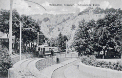 - Triebwagen 23 (um 1930) unterwegs zum Bahnhof Mödling, kurz vor der Einfahrt in die Haltestelle Klausen. Links im Bild die Begrenzungsmauer zur heutigen Adresse Mödling, Neuweg 1 bzw. Frauensteingasse 8. Rechts vom Triebwagen die von diesem teilverdeckte Mödlingbach-Brücke, der frühere Übergang von Frauensteingasse zu Spitalmühlgasse.