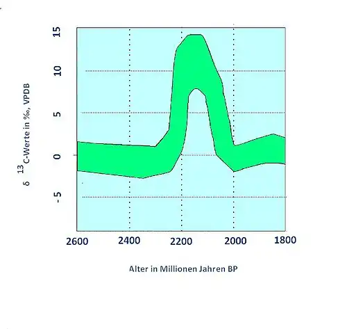 Martin u. a. (2013a) bestimmten eine Maximaldauer für die positive δ13C-Isotopenexkursion von 249 ± 9 Millionen Jahren (Intervall 2306 bis 2057 Millionen Jahre BP) sowie eine Minimaldauer von 128 ± 9 Millionen Jahren (Intervall 2221 bis 2093 Millionen Jahre BP).[19] Der positive Ausschlag dürfte in einem Zug erfolgt sein, die Autoren schließen jedoch bei zukünftiger Feinauflösung mehrere Ausschläge nicht aus.