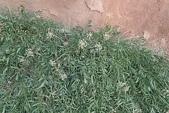 Die wechselständig angeordneten[4] Laubblätter sind in Blattscheide, Blattstiel und Blattspreite gegliedert. Die kahle Blattspreite ist fiederteilig mit drei oder vier Paaren von Blattsegmenten. Die Blattsegmente sind bei einer Länge von (0,5[3]) 1 bis 4 Zentimetern[4] sowie einer Breite von 0,2[4] bis 1,2 Zentimetern lanzettlich bis elliptisch.[3]