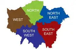 Zur Umsetzung des Planes wurde London in fünf Teilregionen aufgeteilt. Die derzeitigen Regionen wurden im Februar 2008 als Teil der „Weiteren Änderungen des London Plan“ festgelegt.[4] Diese Teilregionen, die jeweils einen eigenen Entwicklungsplan besitzen,[5] sind: