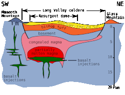 Die Long Valley Caldera liegt im östlichen Teil des US-Bundesstaates Kalifornien an der Grenze zu Nevada, in Mono County etwa 25 km südlich des Mono Lakes. Sie ist ein aktives vulkanisches Gebiet, das aufgrund einer heftigen explosiven Vulkaneruption vor 760.000 Jahren auf einer Fläche von 544 km² (ca. 32 km mal 17 km Ost-West bzw. Nord-Süd-Ausdehnung) einbrach und gegenüber der heutigen Umgebung rund 300 m bis 1000 m eingesenkt ist. Bei der Long Valley Caldera handelt es sich um eine der größten Calderen der Erde und die nach Yellowstone zweitgrößte Caldera der USA. Bei der plinianischen Eruption des Supervulkans wurden innerhalb von sechs Tagen 1400 km³ rhyolithischer Asche und Pyroklastika ausgeschleudert. Die 3300 km³ bis 6600 km³ große Magmakammer enthält noch 900 bis 1400 km³ rhyolitischer Schmelze.[1]