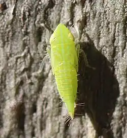 Die Nymphen sind hellgrün gefärbt. Sie weisen ebenfalls einen spitzen Vertex sowie gelbe Augen auf. Sie besitzen dorsal vier kleine schwarze Flecke.[1] Das Hinterleibsende läuft nach hinten spitz zu.[1]