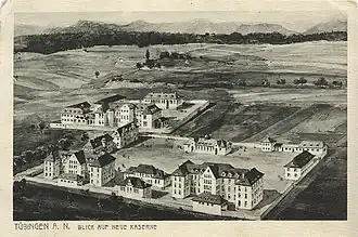Nachdem der Bau der Loretto-Kaserne 1913 beschlossen wurde, wurde sie am Anfang des Ersten Weltkrieges, in den Jahren 1914–1916, für das neue dritte Bataillon des Infanterieregiments 180 in der heutigen Tübinger Südstadt gebaut. Damals lag sie am Stadtrand – ohne direkten Kontakt zur anderen Bebauung. Zunächst wurde sie Neue Kaserne genannt, um sie von der ersten Tübinger Kaserne, die seither Alte Kaserne, später Thiepval-Kaserne genannt wurde, zu unterscheiden. Das Gelände am Fuße des Galgenbergs von der Fläche drei Hektar musste die Stadt kostenlos zur Verfügung stellen.[1] Es wird von folgenden Straßen umgeben: Katharinenstraße (im Norden – ursprünglich Mackensenstraße), Paulinenstraße (im Osten), Stuttgarter Straße (im Süden – ursprünglich Hindenburgstraße). Im Westen ging die Kaserne ursprünglich nur bis zur heute nicht mehr existierenden Linsingenstraße. Später wurde diese Straße aufgelöst und das Kasernenareal um ein trapezartiges Grundstück bis zur Hechinger Straße erweitert, das die Kasernengesamtfläche um mehr als 50 % vergrößerte. Die Kaserne bestand aus zwei großen Mannschaftsgebäuden und zahlreichen kleineren Gebäuden. Alle Gebäude standen an den drei Außenstraßen, die Mannschaftsgebäude selbst standen entlang der heutigen Katharinenstraße. Die südliche Außenflanke war zunächst unbebaut, aber bald baute man hier Pferdeställe. Die Mitte des Kasernengeländes blieb unbebaut und konnte als Exerzierplatz genutzt werden. Ursprünglich gehörte zu der Kaserne auch das durch einen Weg, der bald zur heutigen Stuttgarter Straße ausgebaut wurde, abgetrennte und sich bis zur Alexanderstraße hinziehende Gelände des Garnisonslazaretts. Auf dem später angeschlossenen Gelände bis zur Hechinger Straße wurden nur Fahrzeugschuppen errichtet.