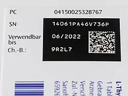 - ↑ a b DIN EN 1041:2013-12 Bereitstellung von Informationen durch den Hersteller von Medizinprodukten: 3.1 Charge, Partie; 3.2 Chargenbezeichnung; Losnummer; Chargennummer; Serienbezeichnung.