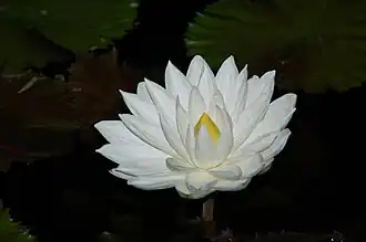 Die Lotosblüte ist ein in der altägyptischen Kunst häufig verwendetes Motiv, sowohl in der Baukunst, der Malerei als auch in der Goldschmiedekunst. Architektonisch findet die sogenannte „Lotosbündelsäule mit geschlossenem Kapitell“ Verwendung. Vorbild hierfür waren als Bündel zusammen gebundene Lotosblüten[11]. Solche Säulen sind aus Privatgräbern des Alten, Mittleren und Neuen Reiches erhalten. Die Lotosbündelsäulen ähneln den Papyrusbündelsäulen, unterscheiden sich jedoch durch den unteren Schaft, der bei den Lotosbündelsäulen gerade verläuft.[12] In Gräbern der 18. Dynastie (Neues Reich) wird in den Wanddekorationen sehr häufig die blaue Lotosblüte abgebildet, an deren Duft sich die Verstorbenen erfreuen sollen. Andere Wandmalereien zeigen Personen, die Bündel von Lotosblüten in den Händen halten oder die Blüte als Kopfschmuck tragen.