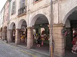 In den Arkaden befanden sich die Läden, die durch trapons verschlossen waren. Der unterste Teil war fest, der obere Teil ließ sich in der Mitte öffnen, wobei der obere Laden hochgeklappt wurde und der untere horizontal den Tisch für die Handelswaren bildete.[20]