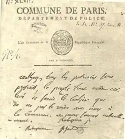 - ↑ „La justice condamne les fonctionnaires à la probité; la justice rend le peuple heureux et consolide le nouvel ordre des choses.“ Zitiert bei Gerd van den Heuvel: Terreur, Terroriste, Terrorisme. (= Handbuch politisch-sozialer Grundbegriffe in Frankreich. 1680–1820. Heft 3. Ancien Régime, Aufklärung und Revolution. Band 10). Oldenbourg, München 1985, ISBN 3-486-52731-2, S. 26.