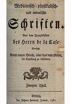 - Medicinisch-physikalisch- und moralische Schriften. Aus dem Französischen des Herrn de la Case übersetzt. J. F. Junius, Leipzig 1765, Erster Theil. (Digitalisat), Zweyter Theil, nebst einem Briefe, über das beste Mittel, die Erziehung zu befördern (Digitalisat)