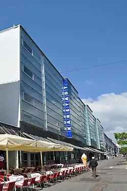 Auf der anderen Straßenseite und durch die moderne Glasfassade stark kontrastierend befindet sich Karstadt. 1966 bis 1968 wurde das Kaufhaus als Hertie erbaut. Das am 1. März 1968 eröffnete Großkaufhaus verfügte über das erste Parkhaus im Obertaunuskreis. Das Kaufhaus spaltete die Meinungen: Während der Neubau als Publikumsmagnet und Beleg der Zentrumsfunktion Bad Homburgs gesehen wurde, wurde (zum Beispiel im Prognos-Gutachten) als „maßstabslose Verbauung“ kritisiert.[16] Ein weiteres großes Einzelhandelsgebäude ist Möbel Meiss an der Ecke zur Ferdinandstraße.