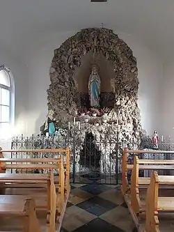 Die Kirchenbänke sind aus hellem Tannenholz und schlicht gehalten. Sie bieten für etwa 30 Personen Platz. Die Kapelle hat einen imposanten Hochaltar in Form einer stilisierten Grotte mit der Statue Unserer lieben Frau in Lourdes. Links ist eine Statue der Bernadette Soubirous in demütiger, anbetender Haltung. Auf der rechten Seite, auf einem Nebentisch, steht eine Figur von Jesus.