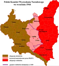Am 22. Juli 1944 wurde von Josef Stalin in Chełm aus dem Nationalen Rat und dem Bund Polnischer Patrioten ein „Polnisches Komitee der Nationalen Befreiung“ gegründet. Nachdem sowjetische Truppen die deutsche Besetzung der Stadt Lublin beendet hatten, wurde diese zur ersten polnischen Hauptstadt der Nachkriegszeit ausgerufen. Das Komitee sollte formell die Macht ergreifen, sobald die Rote Armee die Curzon-Linie überschreiten würde. Dies geschah in Lublin am 22. Juli 1944, und drei Tage danach zog das Komitee dorthin um. Dort bildete es unter dem Vorsitzenden Edward Osóbka-Morawski de facto die Regierung des von der Roten Armee besetzten Gebietes westlich von Ostpolen. Es gilt als moskauhörige Marionettenregierung.[1] Am 27. Juli wurden die ersten Mitglieder des Komitees aus Moskau nach Polen eingeflogen.[2]