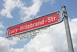 - ↑ Link zu Emil Händlers Festvortrag anlässlich der Straßenbenennung mit Beispielen Lucy Hillebrandscher Werke, abgerufen am 15. August 2018