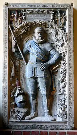 Eine nahezu lebensgroße Darstellung des Ludolf von Eltz in voller Ritterrüstung findet sich auf einer steinernen Grabplatte im Südanbau von St. Petri.[1] Das Kunstdenkmal beschrieb der Denkmalschützer Carl Wolff Anfang des 20. Jahrhunderts: „Ebendort ist ein sehr schön gearbeiteter, farbig behandelter Grabstein (Fig. 5) aufgestellt; in einer halbkreisförmig überdeckten Nische steht der Verstorbene im Harnisch, umgeben von Helm, Handschuhen, Waffenstücken und Siegeszeichen mannigfacher Art. Oben befinden sich zwei Wappen, bezeichnet: ‚Lvdolf v. Eltz‘ und ‚Anna Zigemeier‘.“[2]