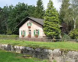 An der Strecke standen 69 Schleusen- und Kanalwärterhäuser, die nach einem Musterplan gebaut waren, der im Detail je nach Gelände angepasst werden konnte. Nach Angaben[9] von Pechmann stammte der Musterplan für die einstöckigen Häuser ebenfalls von ihm, erfuhr jedoch eine Korrektur durch den Baukunstausschuss (unter Leo von Klenze), sodass sie „einen freundlichen und gefälligen Anblick gewähren“ konnten. Die dazugehörenden Grundstücke waren zum Gemüseanbau und zur Tierhaltung für die dort lebenden Schleusenwärter und Aufseher vorgesehen.