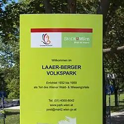 Neben dem Laaerbergbad befindet sich steil abfallend am Südhang des Laaer Berges der große Volkspark Laaerberg, der als Teil des südlichen Wiener Wald- und Wiesengürtels ab dem Jahr 1932 und im Zuge des Badbaues besonders bis 1959 angelegt wurde. Der naturnahe Park besitzt in seiner Mitte den großen Volksparkteich. Im Gelände liegen Kinderspielplätze und eine öffentliche WC-Anlage. In der Nähe des Teichs steht ein Obelisk von Helmut Leherb mit Reliefschmuck auf zwei Seiten, der Tag und Nacht symbolisiert.