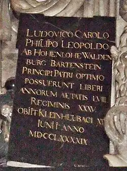 - ↑ a b c d Nach anderer Quelle (ohne Franz): „Ludw[ig] Carl Phil[ipp] Leopold, Erbpr. g. 15. Nov. 731, kais. Rittmeister.“ In: Johann Christoph Gatterer: Fortgesetzter Wappen-Calender auf das Jahr 1764 oder jährliches Handbuch der neuesten Genealogie und Heraldik worinnen aller jezigen Europäischen Potentaten Stammtafeln und Wappen mit einer richtigen Beschreibung und einem Abrisse der Heraldik oder Wappenkunde enthalten sind. Kapitel CXLVI. Stammtafel des Fürsten von Hohenlohe-Bartenstein. Verlag der Raspischen Handlung, Nürnberg 1764, S. 109 (eingeschränkte Vorschau in der Google-Buchsuche).