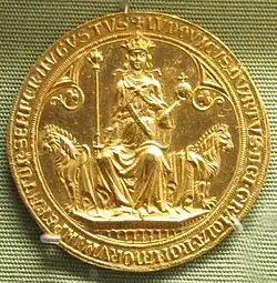 Die 1328 angefertigte Goldbulle zeigt auf der Vorderseite Kaiser Ludwig IV., der zwischen zwei Löwen thront.