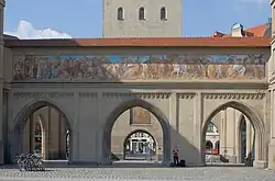 München, Isartor, Fresko entstanden von 1833 bis 1835. Das 20 Meter lange Wandfresko zeigt den feierlichen Einzug Ludwigs des Bayern nach München nach seiner siegreichen Schlacht bei Mühldorf.