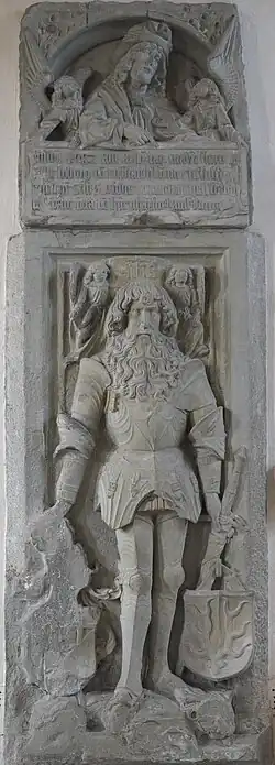 „Ao Dmi 1482 am achte(n) tag mayes starb der edl. He(r) Ludwig vô rotêstain u. leostain ritt(er), stift(er) dis würdigè stifts. Anno Dmni 1501 am 15 tag april sta(r)b die edl fraw iutta vô hirnhaim sun haus fraw. den got gnad“
