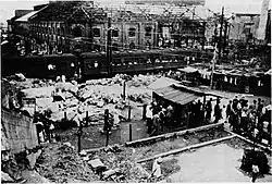 Einen Tag, bevor der Tennō Hirohito in einer landesweit ausgestrahlten Radioansprache die bedingungslose Kapitulation des japanischen Kaiserreichs bekannt gab, erfolgte der letzte Luftangriff auf Osaka. Mit der Mission 328 flog die Twentieth Air Force einen weiteren Angriff auf das Arsenal Osaka. Die zwei vorhergehenden Luftangriffe waren wenig erfolgreich und konnten die Arsenale nicht nachhaltig zerstören. Auf den Marianen starteten nochmals 161 B-29 vom 73rd Bombardment Wing, die mit 1.000-Pfund-AN-M65 (454 kg) und 2.000-Pfund-AN-M66 (907 kg) Sprengbomben beladen waren. Der Einsatz erfolge mit Jagdschutz von P-47 Thunderbolt und P-51 Mustang des VII Fighter Command.[69] 147 Bomber erreichten die Stadt bei guten Sichtverhältnissen, in einer Höhe von 6.736–7.650 m. 145 Bomber warfen 640,9 Tonnen Sprengbomben auf die Arsenale ab.[70] Von den abgeworfenen 843 Bomben schlugen 650 im Zielgebiet ein und zerstörten weitere 44,5 % der Arsenalgebäude.[13] Zehn weitere Bomber konnten das Zielgebiet nicht ausmachen und luden ihre Bomben ungezielt über der Stadt ab. Vier AN-M66-Bomben einer B-29 trafen den Bahnhof Kyōbashi, der mit Menschen überfüllt war, die auf ihre Evakuierung aus der Stadt warteten. Die Bomben trafen zwei vollbesetzte Züge sowie einen Bahnsteig mit wartenden Menschen. Es konnte nie ermittelt werden, wie viele Menschen durch diese Bombentreffer ums Leben kamen. Daneben griffen die Jagdflugzeuge der Eskorte mit Bordwaffen ebenfalls Bodenziele an.[71] Der letzte Luftangriff auf Osaka zerstörte weitere 1.009 Wohngebäude sowie neun Fabriken.[72] Gemäß japanischen Angaben forderte der Angriff in der Stadt 396 Tote, 122 Verletzte und über 500 Vermisste (ohne die Opfer vom Bahnhof Kyōbashi). 2.284 Personen wurden durch den Angriff obdachlos und 1.921 evakuiert.[73] Das heftige Flakfeuer über dem Ziel beschädigte 26 Bomber, führte aber zu keinen Verlusten. Vier B-29 mussten auf dem Rückflug auf Iwojima notlanden.[13] Noch bevor die letzten Bomber wieder auf den Marianen gelandet waren, gab der US-amerikanische Präsident Harry S. Truman die Einstellung der Kampfhandlungen bekannt.[74]