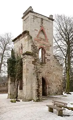- Das Tempelherrenhaus im Goethe-Park, am 9. Februar und am 31. März 1945 bis auf den Turm zerstört, dieser als Ruine erhalten