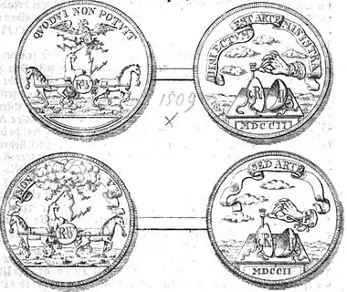 - Die lat. Schrift auf der Vorder- und Rückseite QVOD VI NON POTVIT // DISIECTVM EST ARTE MINISTRA lautet übersetzt nach Johann David Köhler (1744): „Was durch die Gewalt nicht hat können // Ist aus einander geworffen worden durch die Beyhülffe der Kunst.“[5] (Was durch Gewalt nicht zu erreichen war, wurde mit Hilfe der Kunst getrennt.)