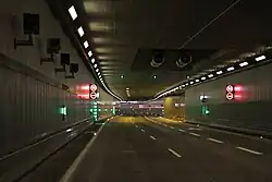 Der 1530 Meter lange Tunnel verfügt über drei Betriebsbauwerke mit Pumpwerk. Elf Notausgänge führen zur Oberfläche. Die Abgase der Fahrzeuge werden jeweils in Fahrtrichtung bei den Tunnelportalen ausgeblasen.[4] Im Tunnel sind stationäre Messgeräte zur Geschwindigkeitsüberwachung mit Fotokameras sowie Videokameras zur Überwachung des Verkehrsflusses vorhanden. Die Kameras in den Nothaltebuchten sind mit einer automatischen Bilderkennung ausgestattet, sobald ein Fahrzeug in der Bucht zum Stehen kommt, wird das Bild der betreffenden Kamera in der Verkehrsleitzentrale auf einen großen Bildschirm geschaltet.[12][13]