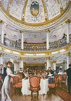 Fast alle öffentlichen Räume der Ersten Klasse, die sich auf dem Bootsdeck des Schiffes befanden, verfügten über mächtige rundgewölbte Glasdächer in voller Raumlänge, was eine lichtdurchflutete Atmosphäre erzeugte und in dieser Form eine völlige Neuheit auf Schiffen war. Auf dem Bootsdeck befanden sich ein Verandacafé, ein Rauchsalon, eine Lounge (auch als Musiksalon bezeichnet), ein großzügiger Eingangsraum als Foyer für das große Treppenhaus des Schiffes sowie ein Lese- und Schreibraum. In der Lounge war das Glasdach besonders aufwändig gestaltet; es war in zwölf Abschnitte gegliedert, in die aus Buntglas Allegorien der zwölf Monate eingearbeitet waren. Ein Deck tiefer war ein so genannter Observationsraum eingerichtet, der aus Bullaugen freie Sicht nach vorne über den Bug aufs Meer erlaubte. Zwar handelte es sich bei diesem „Raum“ an sich nur um einen etwas verbreiterten Kabinengang, doch das Konzept war völlig neu und leitete die Tradition derartiger Beobachtungsräume ein, die noch heute auf vielen Passagierschiffen zu finden sind.[14] Kernelement der Ersten Klasse des Schiffes war ein im Stil Ludwigs XVI. in Weiß und Gold gehaltener Speisesaal, der von einer stuckverzierten Kuppel überragt wurde und insgesamt drei Deckshöhen umfasste. Die besten Kabinen des Schiffes waren die beiden „Royal Suites“ (Königssuiten), die neben zwei Schlafzimmern, einem Bad und separater Toilette einen privaten Salon und ein Esszimmer umfassten. Kleinere Suiten, die aus Schlaf- und Wohnraum bestanden und von denen manche ebenfalls über privates Bad und WC verfügten, ergänzten die Luxusklasse der privaten Unterkünfte auf der Lusitania. Insgesamt gab es auf dem Schiff zehn private Wohnräume (also Kabinen, die keine Schlafgelegenheit boten, sondern lediglich zum Aufenthalt der Passagiere gedacht waren); eine für die damalige Zeit außergewöhnlich große Zahl (auf der fünf Jahre später fertiggestellten Titanic gab es nur vier solcher Räume).[15] Für diese besonders teuren Kabinen gab es ein eigenes Telefonnetz, über das die Bewohner miteinander kommunizieren konnten. Lag das Schiff in New York oder Liverpool am Pier, konnte es sogar an das jeweils städtische Telefonnetz angeschlossen werden, so dass die Passagiere ihre Apparate auch für Festlandsverbindungen nutzen konnten; für die damalige Zeit eine besonders bemerkenswerte technische Innovation. Das große Treppenhaus des Schiffes verband insgesamt fünf Decks (Bootsdeck bis E-Deck) miteinander und war mit aufwändigen schmiedeeisernen Balustraden mit vergoldeten Elementen ausgestattet. Im Treppenschacht waren zwei parallellaufende Aufzüge installiert. Die prunkvolle und großzügige Ausstattung der Ersten Klasse auf der Lusitania sorgte bei ihrer Jungfernfahrt 1907 für Furore unter den Passagieren. Der US-Senator George Sutherland hielt kurz vor der Ankunft eine Lobrede auf das Schiff, bei der er die berühmt gewordenen Worte sprach: She is more beautiful than Solomon’s temple and large enough to hold all his wives and mothers-in-law. (Sie [die Lusitania] ist schöner als Salomos Tempel und groß genug, alle seine Frauen und Schwiegermütter zu beherbergen.)[16]