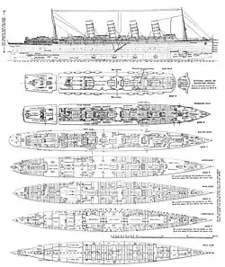 (Detaillierte Deckspläne der Lusitania und Abbildungen einiger der Innenräume finden sich bei den Weblinks.)