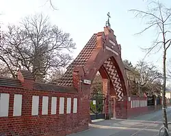 Ein monumentaler Torbau mit einem schmiedeeisernen Kreuz auf dem Giebel macht auf den Eingang des Friedhofes aufmerksam. Direkt hinter diesem Torbau stehen rechts die Friedhofskapelle und links das Verwaltungsgebäude. Das gesamte Ensemble, 1902 geschaffen von dem Architekten Jürgen Kröger, steht unter Denkmalschutz.[2]