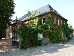Pfarrhaus in Kötzschenbroda mit Einfriedungsmauer, im Boden neben dem Blumenkübel ist die Gedächtnisplatte an den Waffenstillstand mit Schweden eingelassen