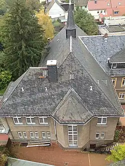 Lutherhaus, vom Turm der Friedenskirche aus; nach rechts das Pfarrhaus