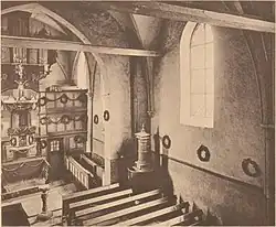 Im Jahre 1777 wurde der bisher kleine Kirchturm um bis zu 20 Meter erhöht und mit einem achtseitigen Turmhelm versehen, an dem eine nach außen hängende „Schlagglocke“ angebracht wurde. Auch der Chorraum wurde auf bis zu 2,60 m aufgestockt, um Mittelschiff und Chor auf eine einheitliche Höhe zu bringen. Die alte Deckenkonstruktion wurde herausgerissen und durch eine Holzdecke ersetzt. Der Chorraum wurde durch eine tragende Holzwand abgetrennt, sodass dahinter ein knapp 4 Meter hoher Raum für die Sakristei entstand. Ebenfalls wurde eine Kanzel mit integriertem Schalldeckel direkt über dem Altar angebracht, die von der Holzwand getragen wurde und nur von der Sakristei aus durch eine Holztreppe zu erreichen war. Über der alten Kanzel befand sich die alte Orgel, die von der Decke der Sakristei gehalten wurde.