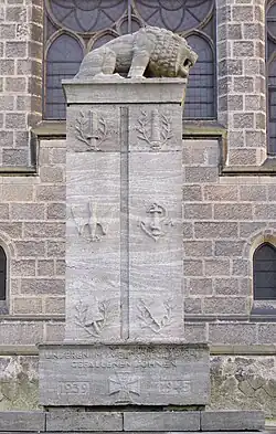 An der Nordseite der Lutherkirche steht das Kriegerdenkmal. Es wurde 1925–1926 ausgeführt und erinnert an die im Ersten Weltkrieg gefallenen Soldaten. Das Denkmal zeigt eine figürliche Darstellung eines brüllenden Löwen. Nach 1945 wurde die Widmung des Denkmals auf die gefallenen Soldaten des Zweiten Weltkriegs erweitert.
