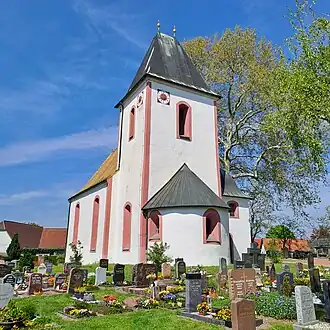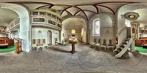 Die Innenausstattung stammt aus dem 17. Jahrhundert und ist schlicht, wie es für evangelische Dorfkirchen typisch ist. Die Kirche besitzt eine dreiseitige Empore. In der Patronatsloge befindet sich zudem eine emblematische Kassettendecke, die kunsthistorisch von Bedeutung ist. Gestiftet wurde diese von Christoph Mühlbach. Eine letzte Restaurierung der Deckenplatten fand 2001 / 2002 durch Volker Wiesner aus Holzhausen statt.[1][2] Die Fenster im Inneren sind zum Teil mit buntem Glas gestaltet.