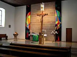 - Das Kruzifix auf dem Holzkreuz aus Lindenholz und das Taufbecken wurden 1937 vom Bildhauer Hanns Leo Albert gefertigt.