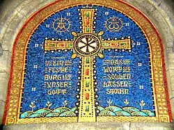 Im Tympanon über dem Haupteingang ist ein Kreuzmosaik zu sehen, das mit zwei Kernsätzen aus Martin Luthers Kirchenlied Ein feste Burg ist unser Gott verziert ist: Ein feste Burg ist unser Gott und Das Wort sie sollen lassen stahn. Im Kreuz ist das Christusmonogramm zu sehen, links und rechts über dem Kreuz die beiden griechischen Buchstaben Alpha und Omega als Zeichen, dass Jesus Christus Anfang und Ende der Welt und allen Seins ist (vgl. Offenbarung des Johannes 22,13).