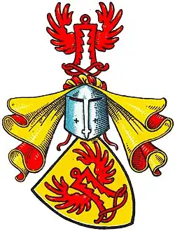 Blasonierung: In Gold eine herabhängende rote geflügelte Pferdepramme. Auf dem rot-golden bewulsteten Helm mit rot-goldenen Helmdecken die rote geflügelte Pferdepramme.[3]